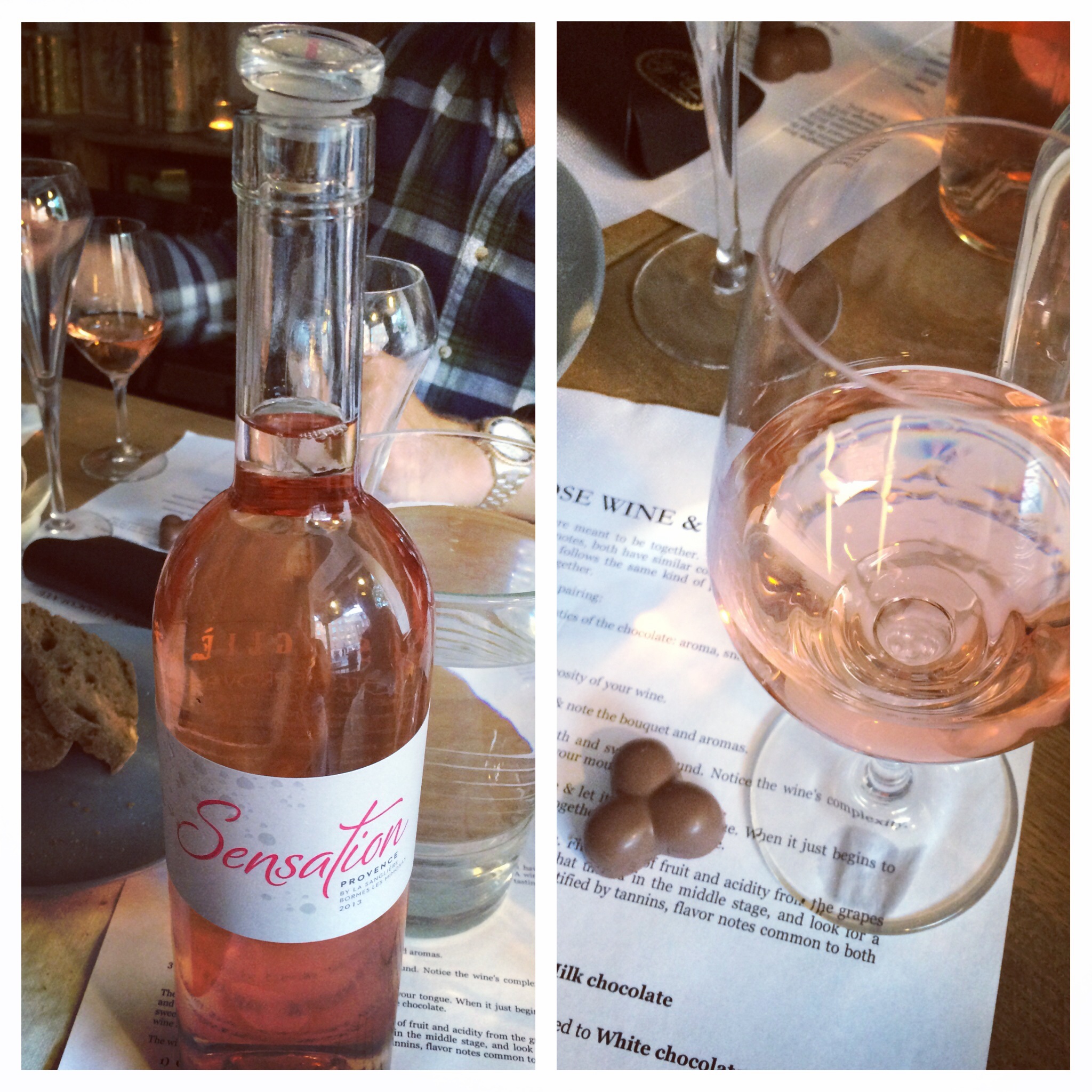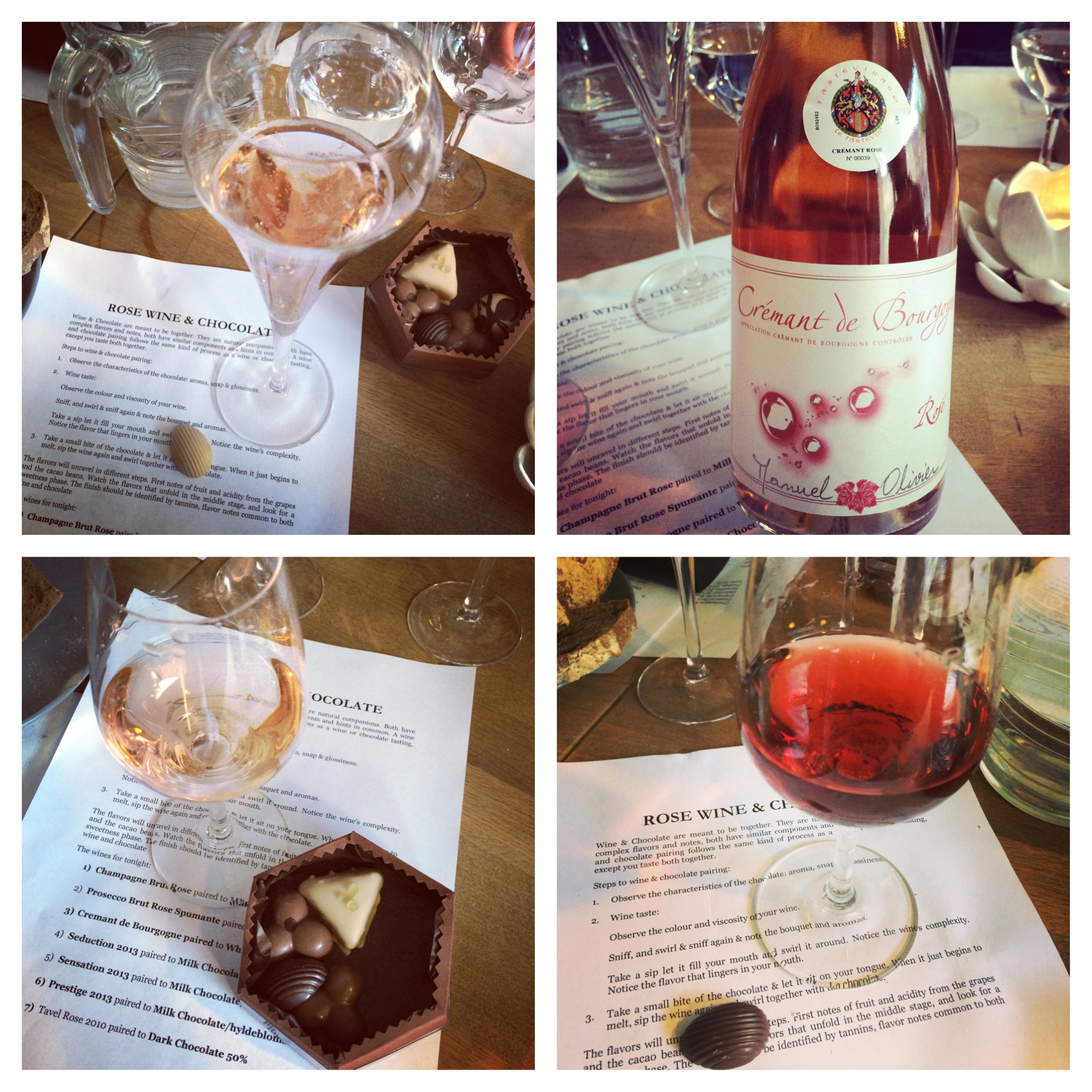 The setup was to taste seven different rosés, three of them sparkling (a champagne, a prosecco and a crémant). To each of the wines, we were to taste a hand-picked and hand-made-for-the-occasion chocolate – some were plain, others were filled, all were delicious! They were made by Chokolade-Hex who really did work some magic! You can also find her on Facebook.