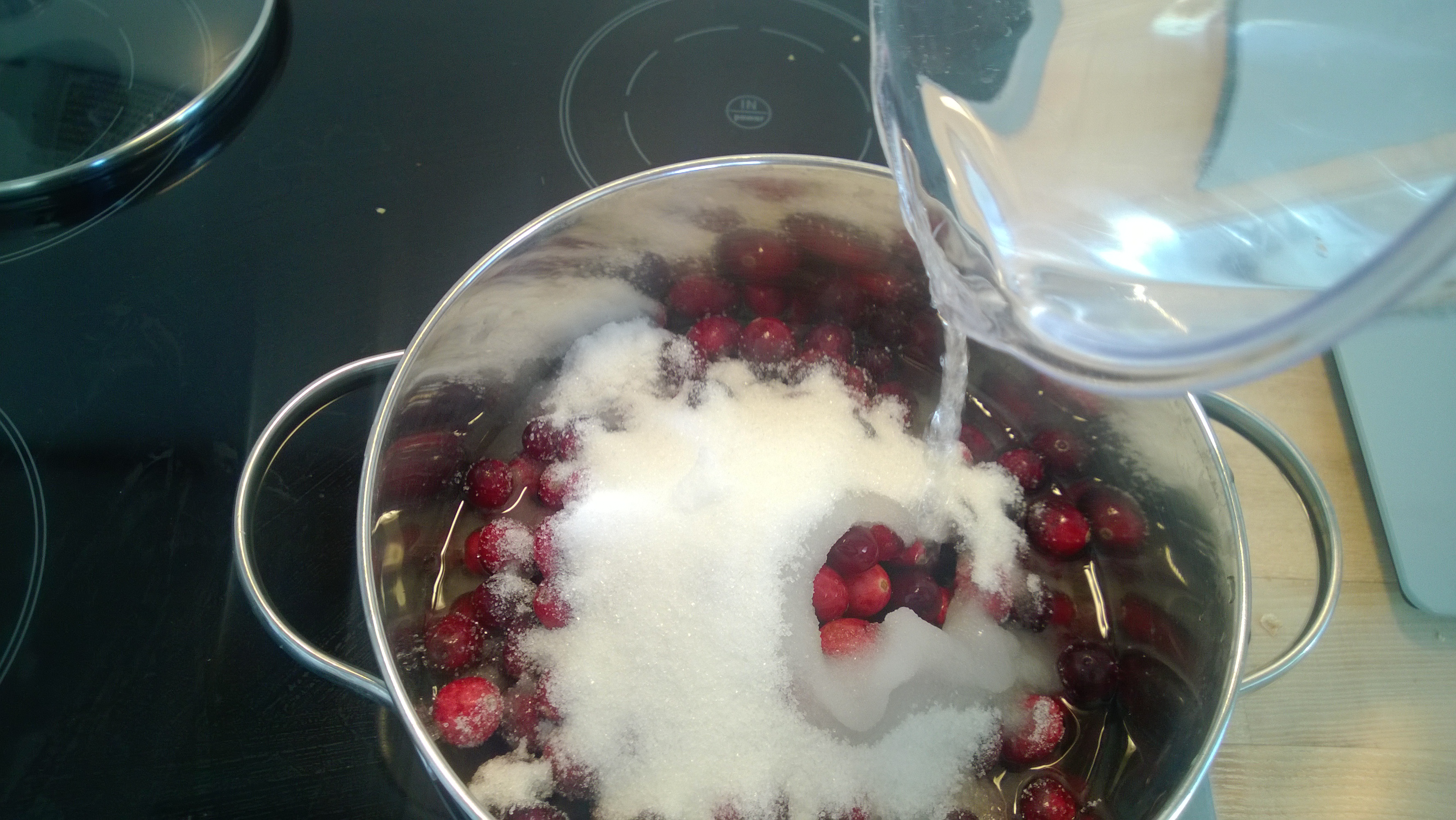 500g Cranberries, 250g Zucker und 300ml Wasser in einen großen Topf geben und zum Kochen bringen.