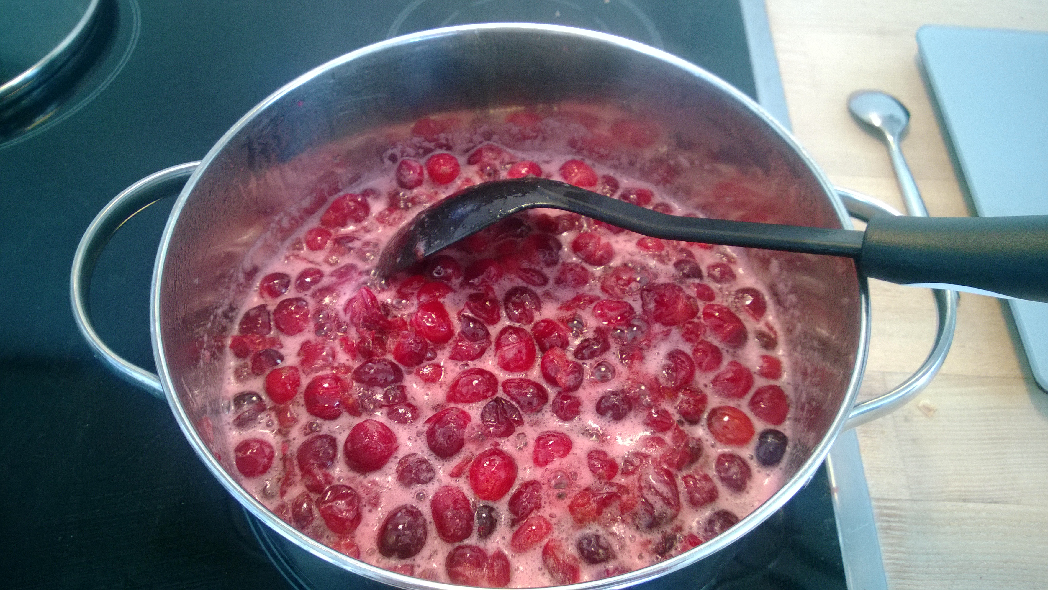 Bei mittlerer Hitze solange kochen lassen, bis der Zucker vollständig aufgelöst ist – Achtung, die Cranberrys platzen auf (Spritzgefahr!). Unter ständigem Rühren ca. 10-15min weiterköcheln.