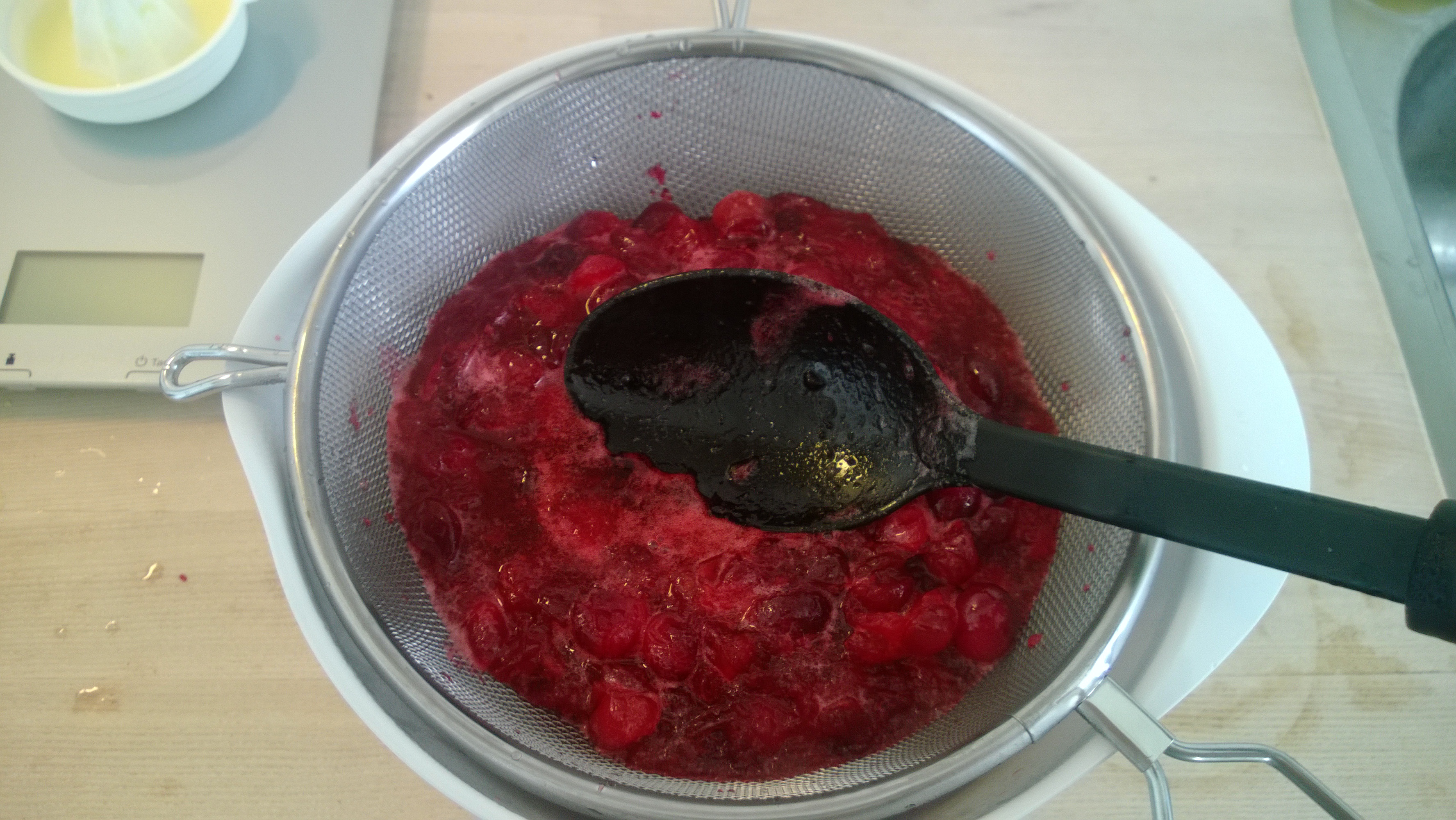 Die Masse in ein feines Sieb geben und vorsichtig durchstreichen, bis so viel Flüssigkeit wie möglich durchgelaufen ist (Cranberry-Reste können anderweitig verwendet werden, z.B. als Brotaufstrich).